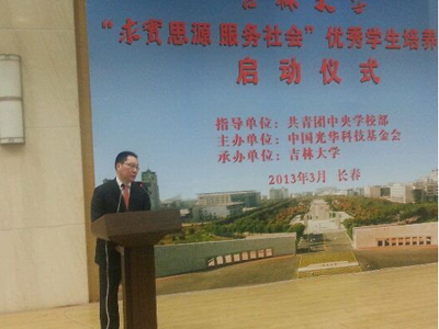 仪式上,张向东副校长代表学校领导致欢迎词。他对与会领导和嘉宾的到来表示热烈的欢迎与诚挚的感谢,对“求实思源、服务社会”优秀学生培养计划的启动表示祝贺。他希望在双方的共同努力下,在吉林大学莘莘学子中培养出一批具有深厚的科学文化知识,并具有强烈社会责任感和服务精神的创新型人才。