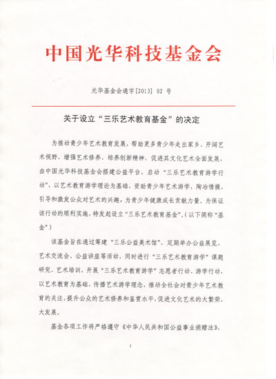 基金设立后,着手筹建的“三乐公益美术馆”将汇聚中国当代热心公益的艺术界精英,激发其爱心和创造力,以推动艺术教育的普及、促进中国艺术教育事业的发展。该美术馆作为艺术家、艺术机构定点捐赠的平台,将帮助他们实现助学梦想,培养更多优秀的艺术人才。与此同时,基金还将邀请中央美术学院对项目进行顶层设计,制定教学内容和计划,编写《艺术教育游学手册》。此外,基金将在专家、志愿者团队的协助下,从全国各地偏远贫困地区推选青少年,以主题性艺术游学的方式开展全面的艺术教育,在三乐公益美术馆举办游学生的艺术游学主题展览、出版画册,并开展国际间的艺术教育游学活动,让中国的孩子了解世界艺术,让全世界的孩子了解中国艺术。