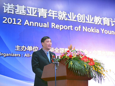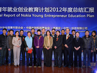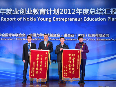 1月20日,“诺基亚青年就业创业教育计划”2012年度总结会在中国光华科技基金会隆重举行。共青团中央国际联络部副部长董霞,中国青年报社常务副社长张坤,诺基亚(中国)投资有限公司体验创新中心总经理傅蕾,中国光华科技基金会副秘书长查德荣,共青团中央国际联络部处长伍伟、诺基亚(中国)投资有限公司可持续发展经理程兆敏、KAB全国推广办公室秘书长魏和平等出席了此次大会。2012年度诺基亚创意创业计划大赛获奖团队成员、优秀高校创业指导教师代表及诺基亚青年就业创业大讲堂的创业导师,也到场参与此次总结会。